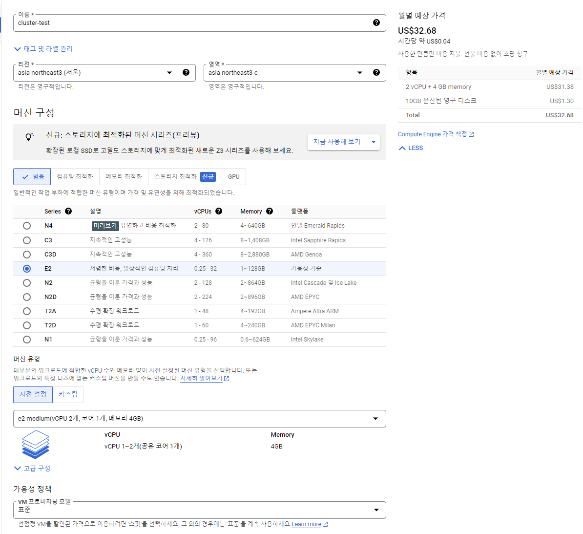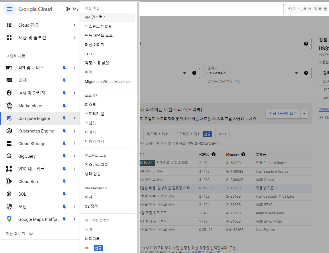 머신 구성으로 보이는 N4, C3, C3D 등등 여러 머신이 존재하는데 어떤 VM을 사용하느냐에 따라 과금 형태가 달라지므로 주의 하길 바란다.